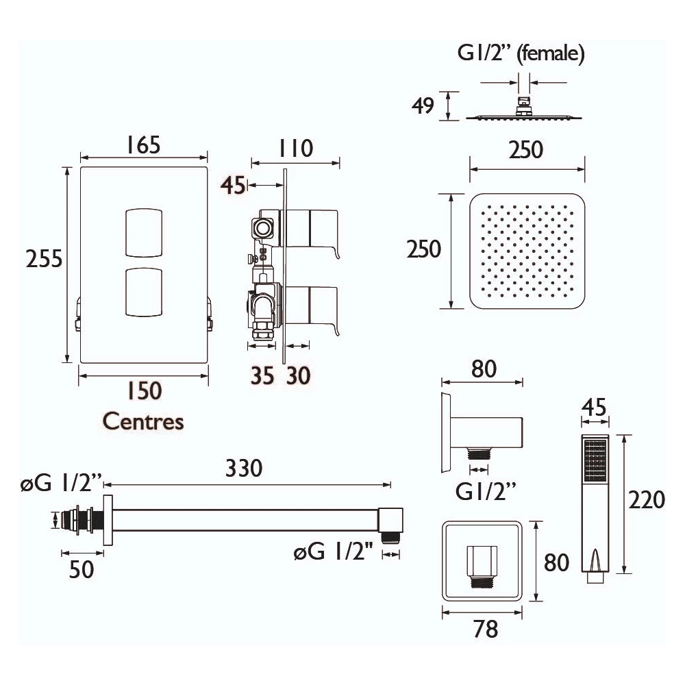 - Supplied complete with Dual Concealed Valve, Fixed Shower Head with Shower Arm and Shower Handset with Hose