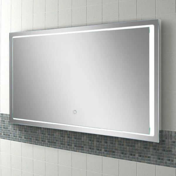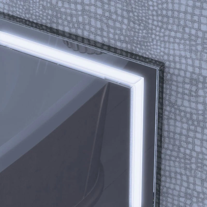 - A stylish mirror on mirror design with chamfered LED lighting between the mirrors