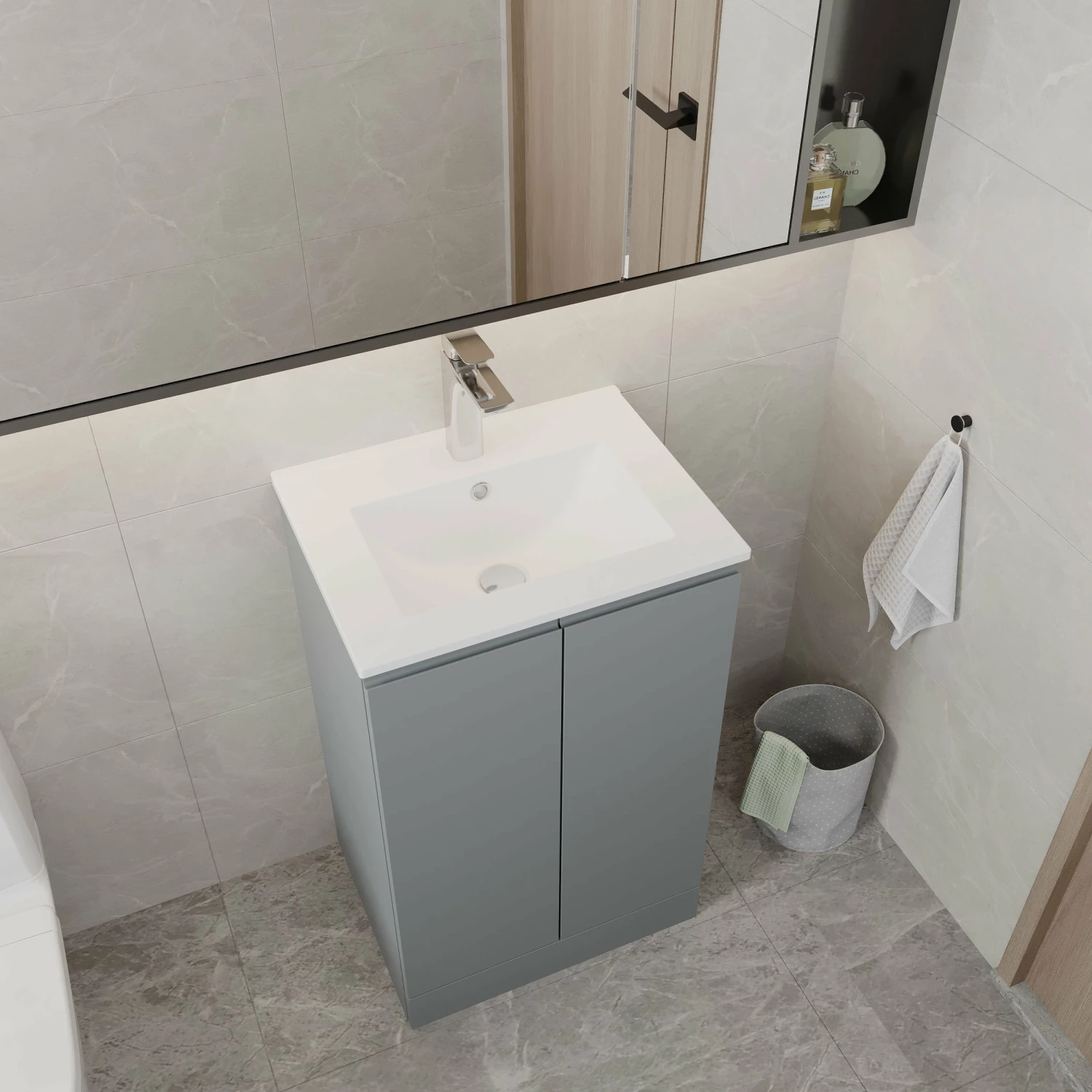 - Contemporary floor standing design provides ample storage for all your bathroom toiletries and cleaning supplies