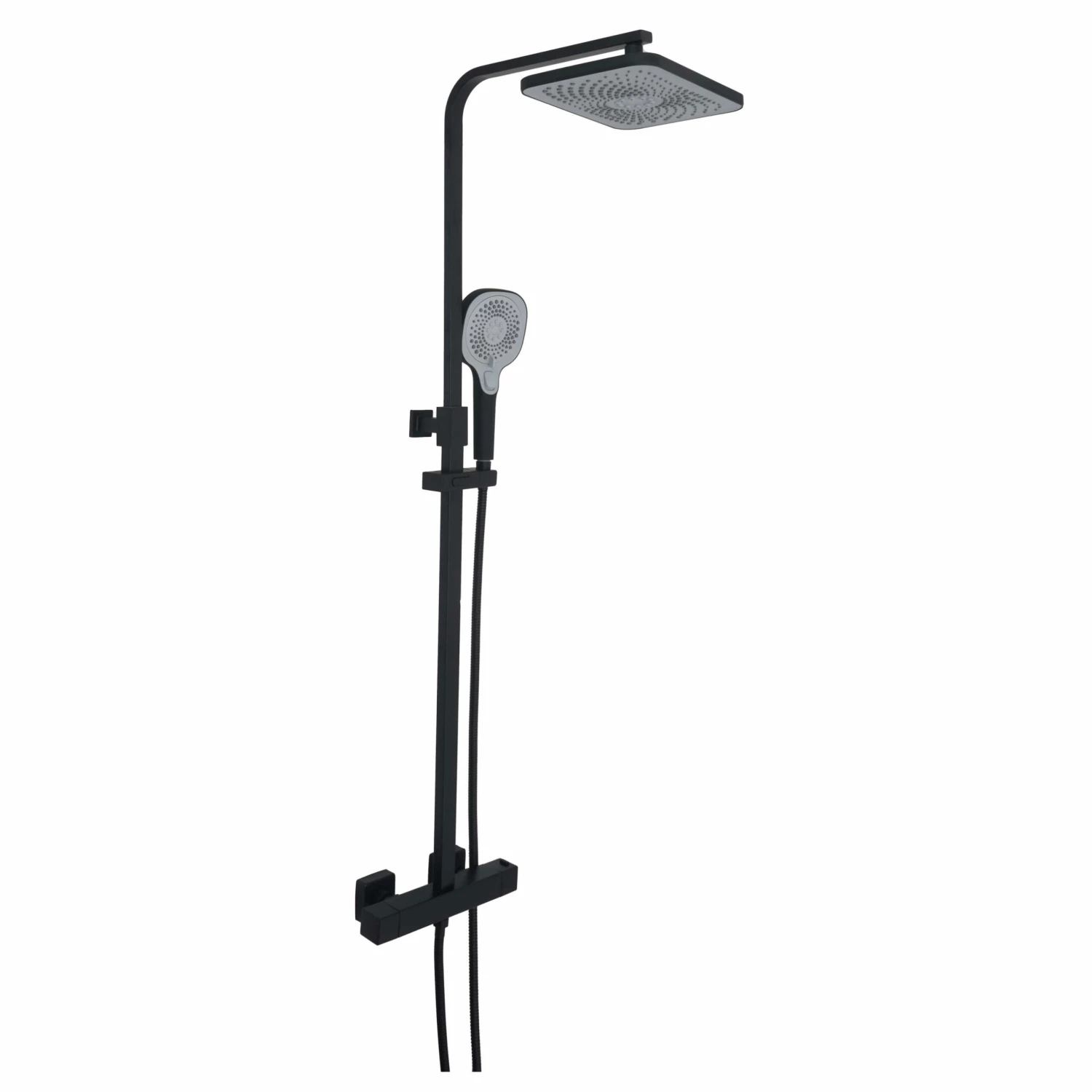 - Includes thermostatic bar valve with 2 outlet, adjustable riser rail, multifunction shower handset, fixed shower head, shower hose