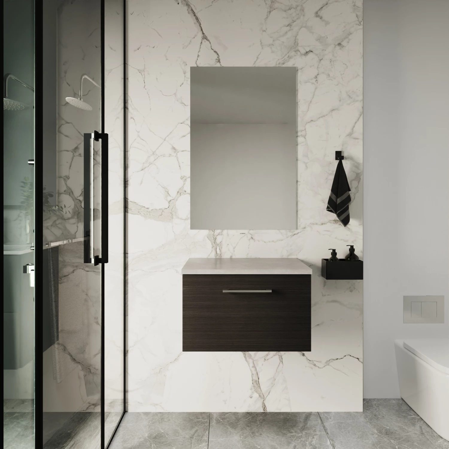 - This unique black woodgrain finish compliments any modern bathroom and creates a designer look