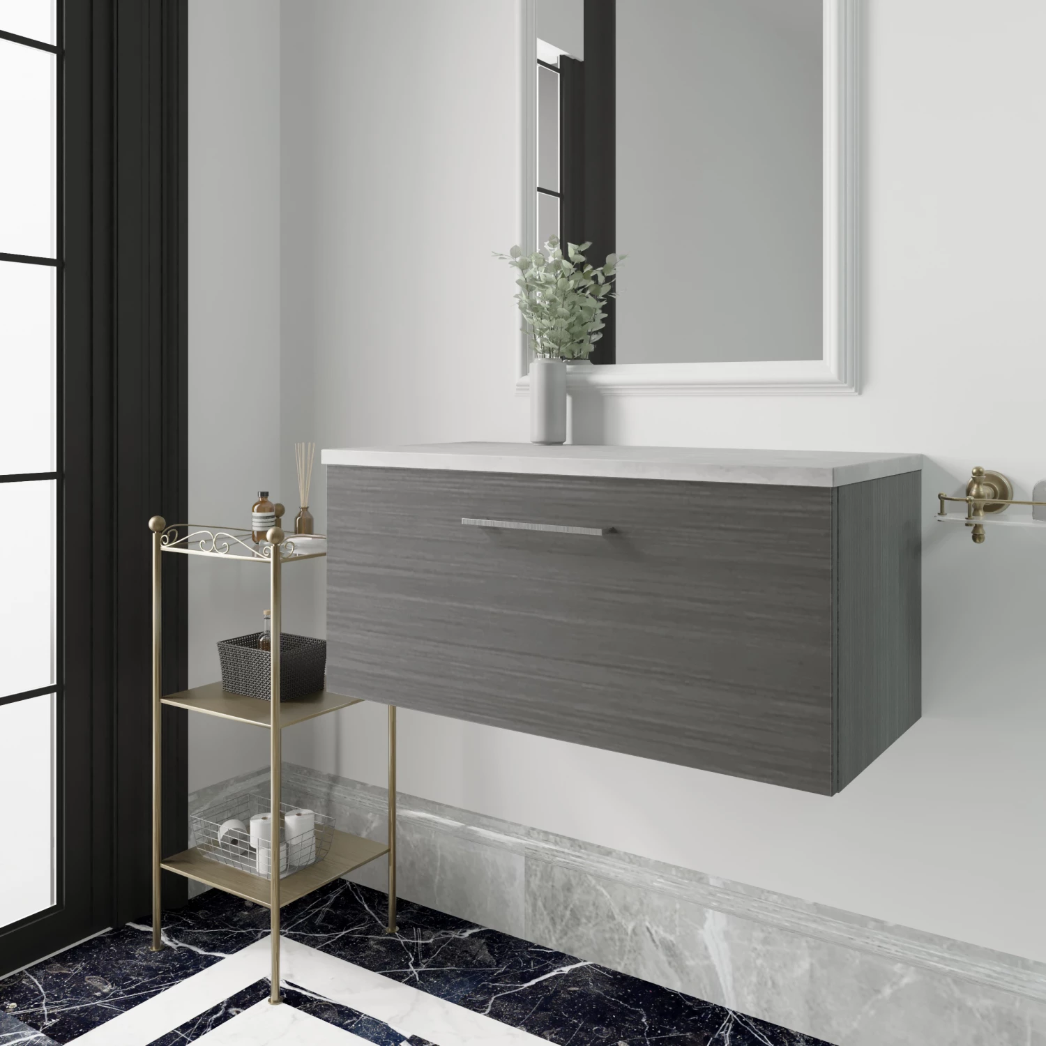 - This unique anthracite woodgrain finish compliments any modern bathroom and creates a designer look
