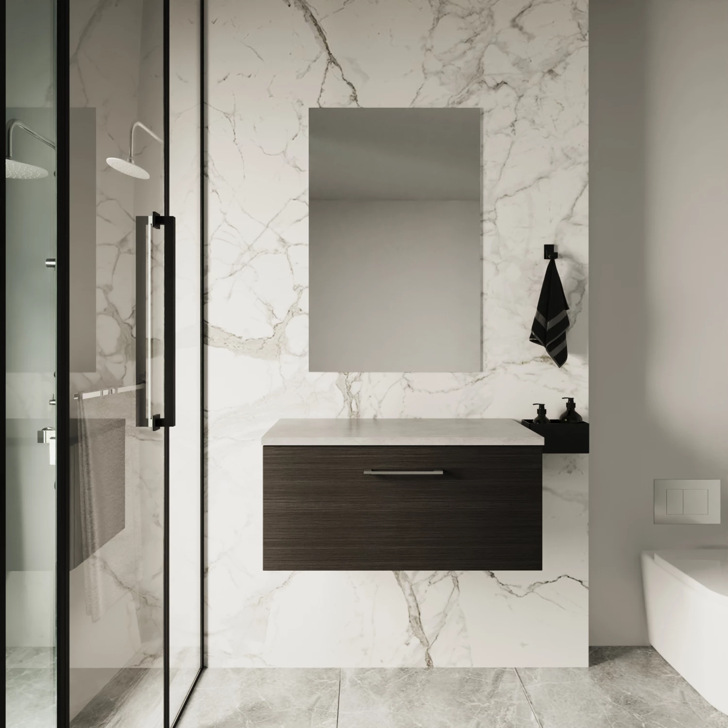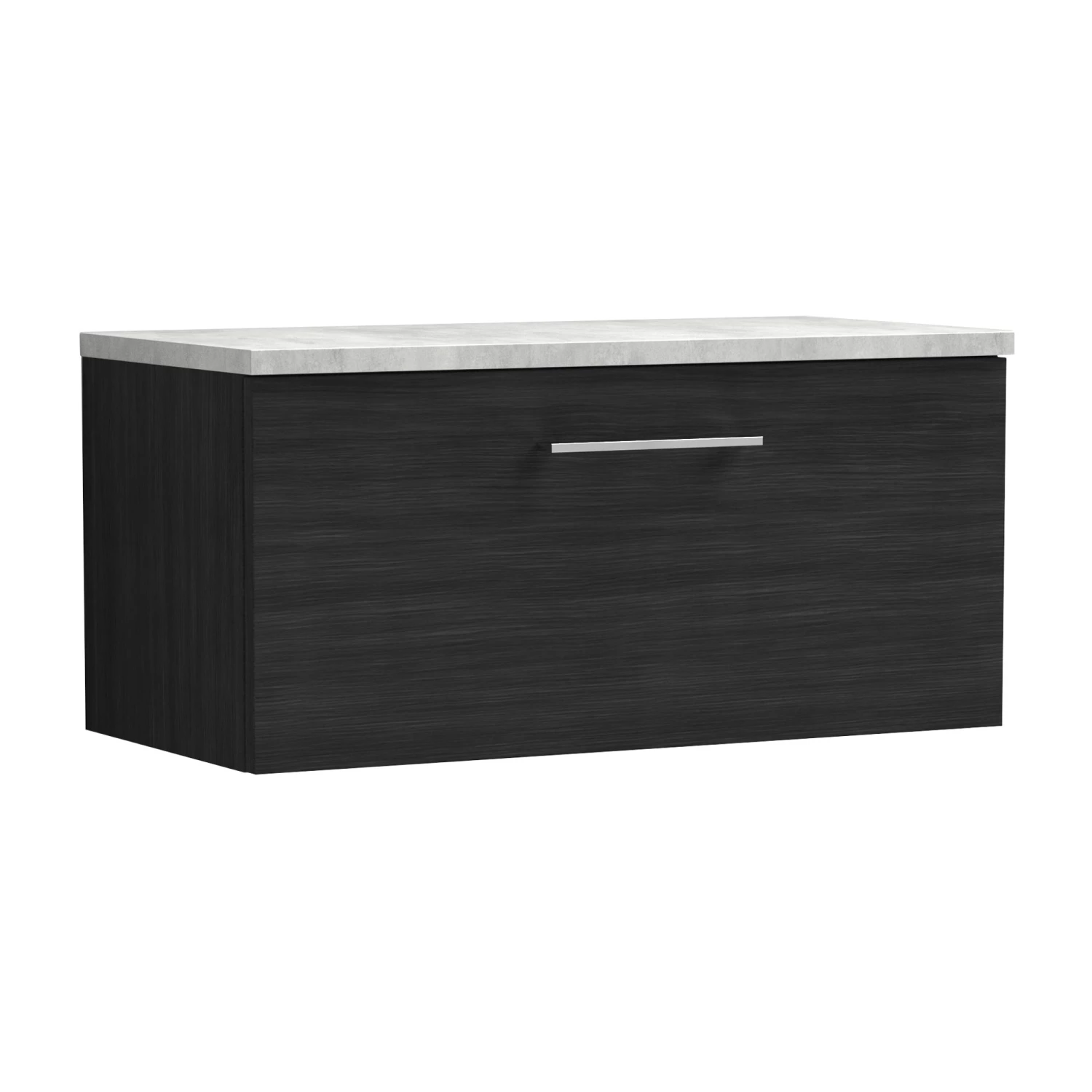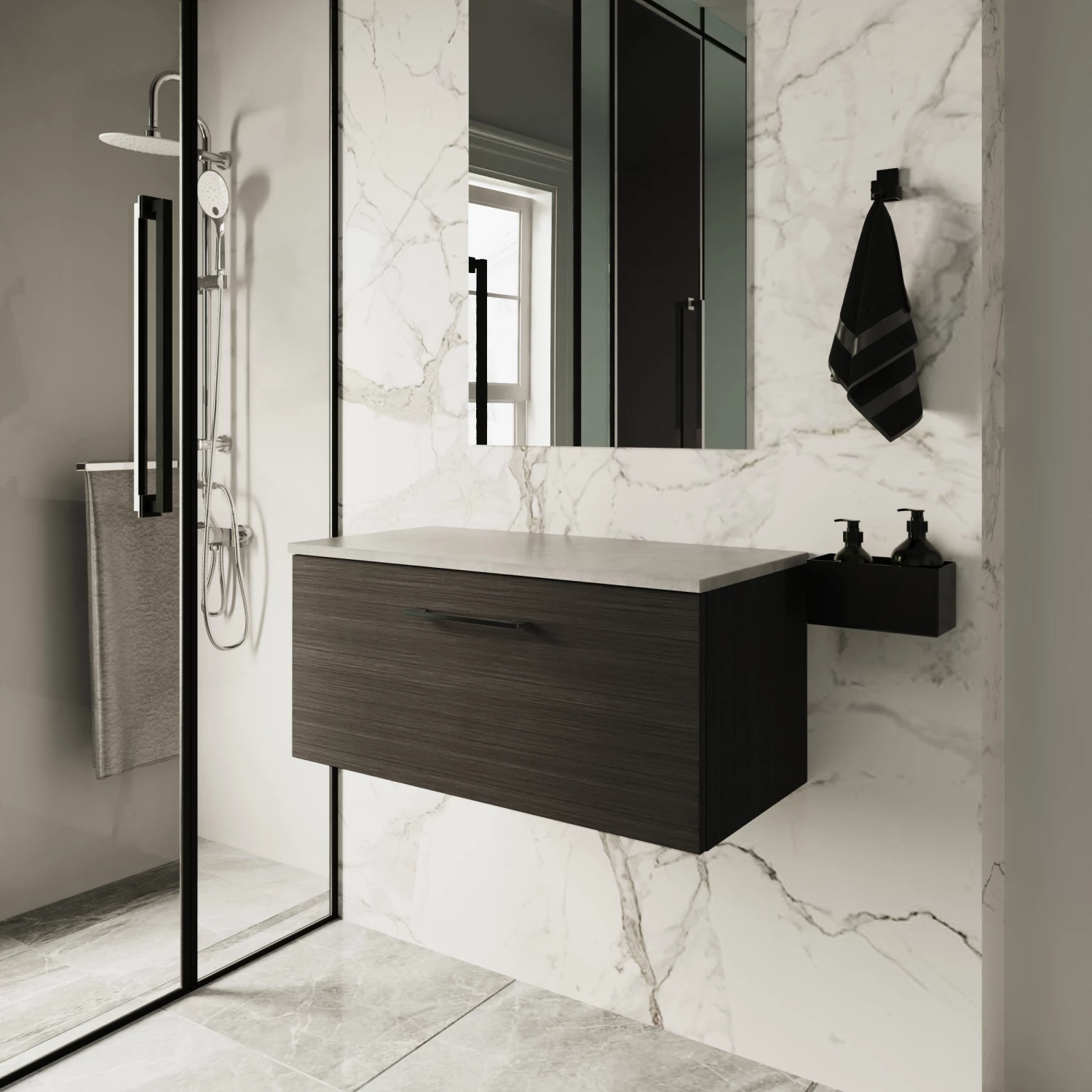 - This unique black woodgrain finish compliments any modern bathroom and creates a designer look