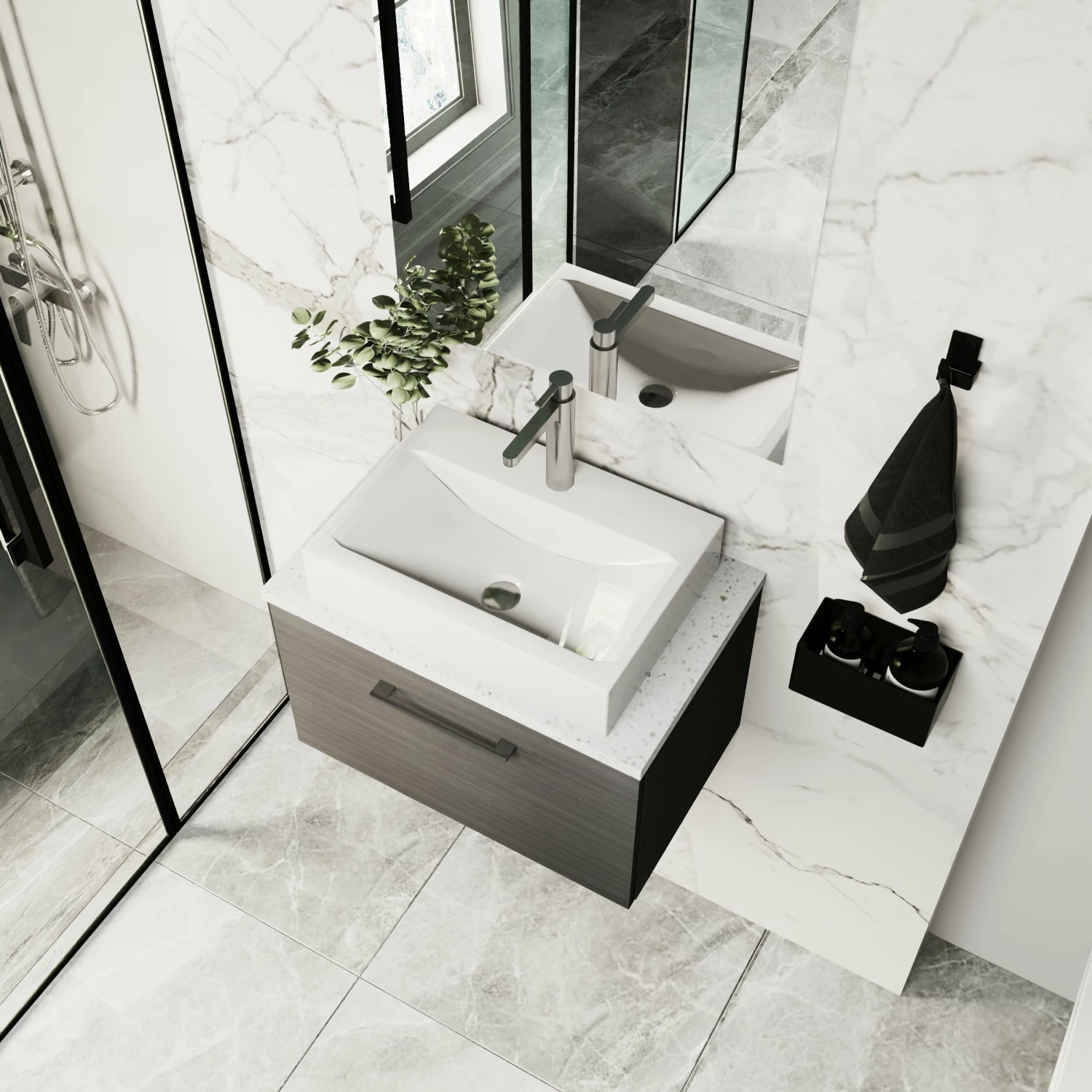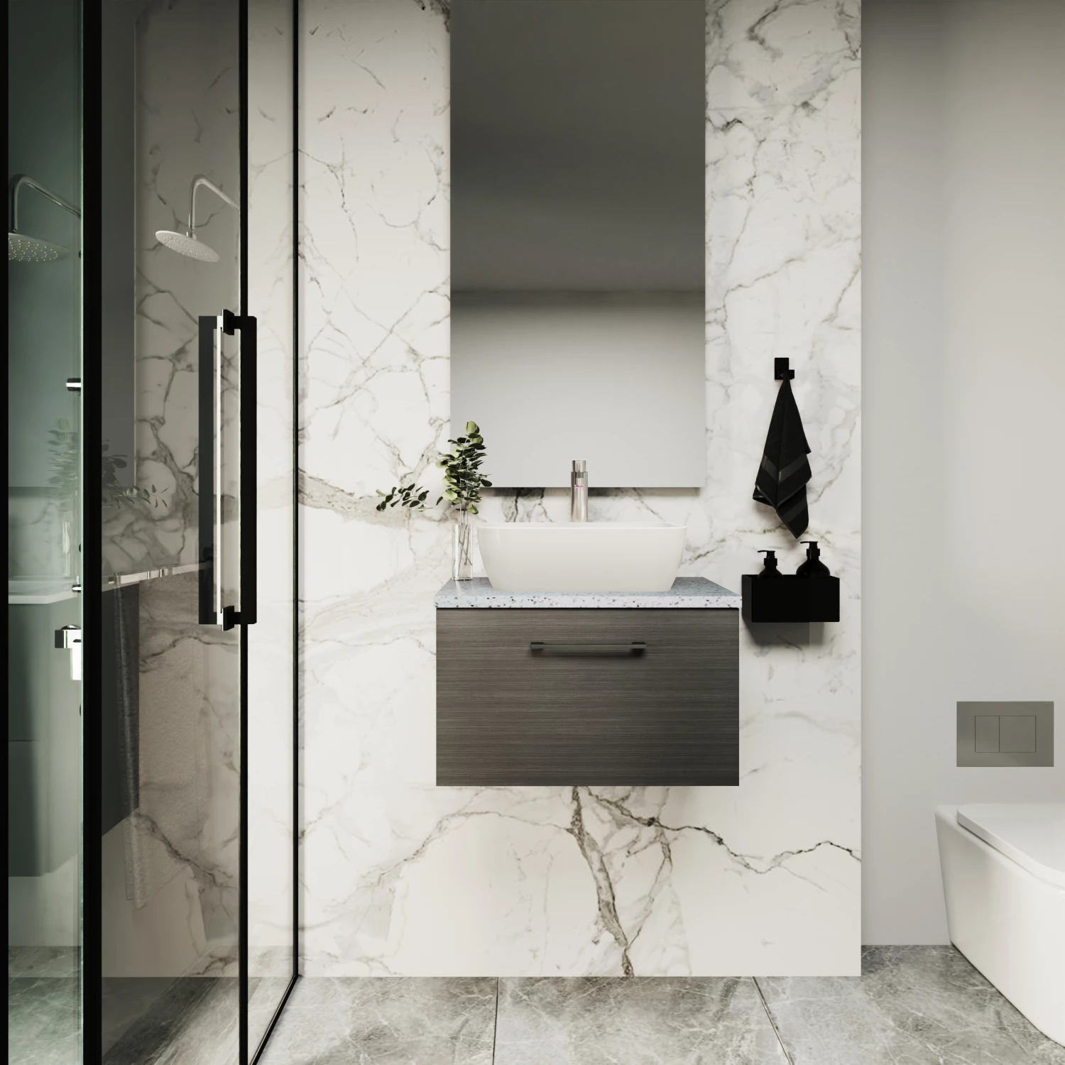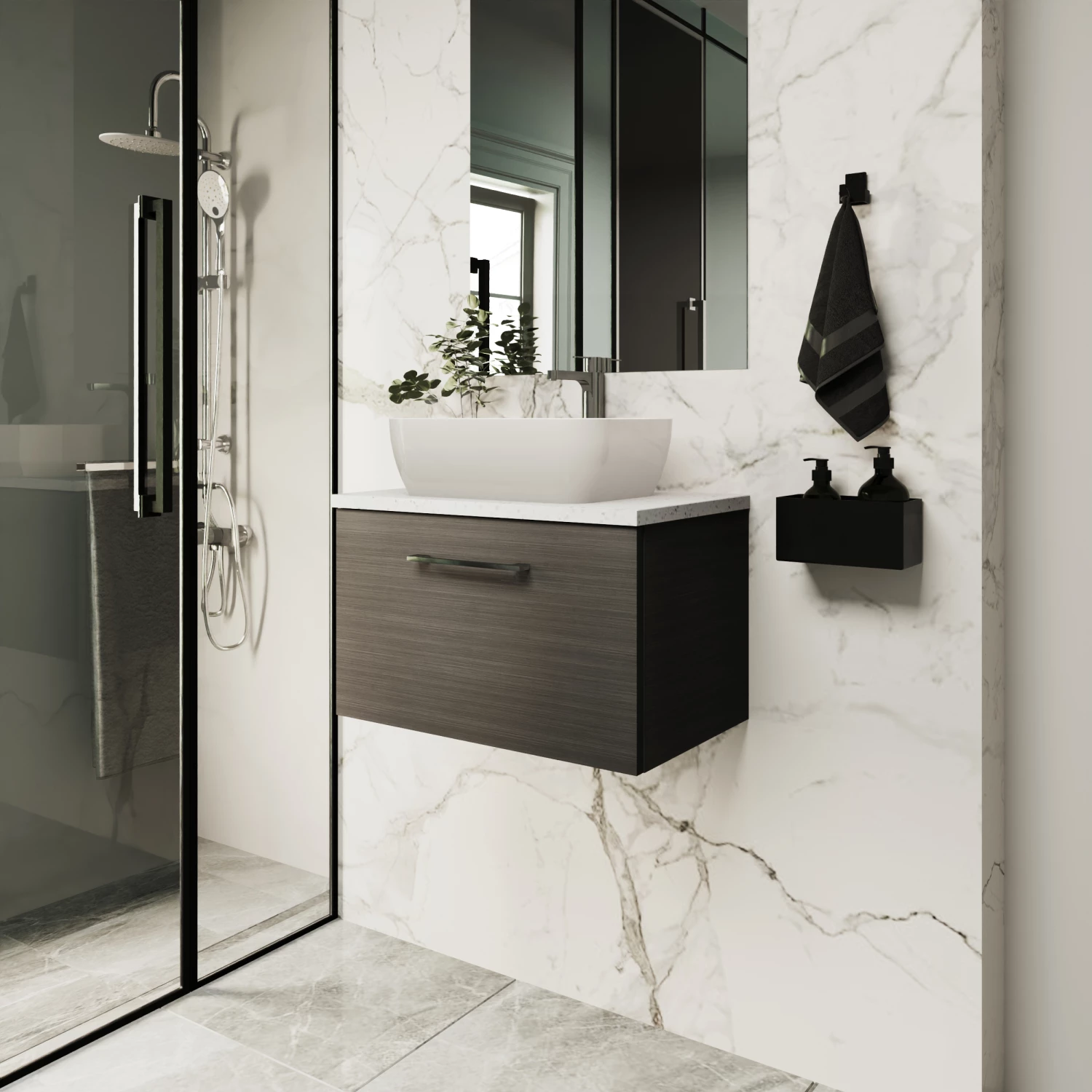 - This unique anthracite woodgrain finish compliments any modern bathroom and creates a designer look