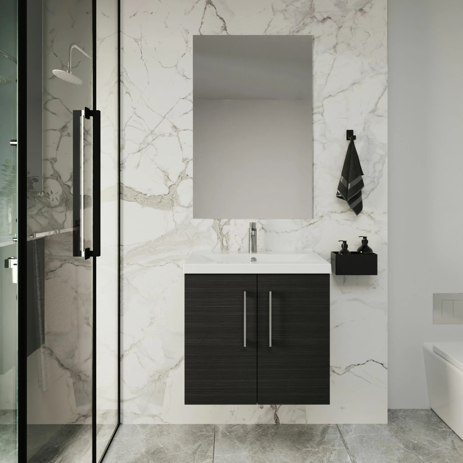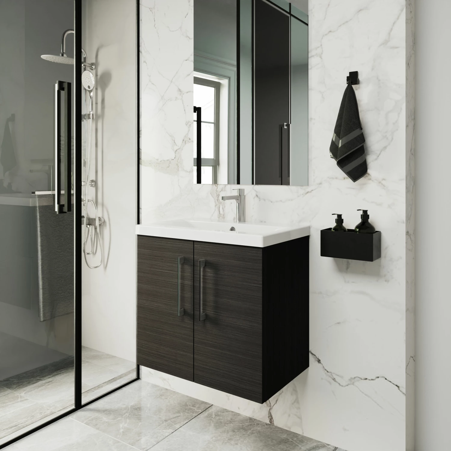 - This unique black woodgrain finish compliments any modern bathroom to create a designer look