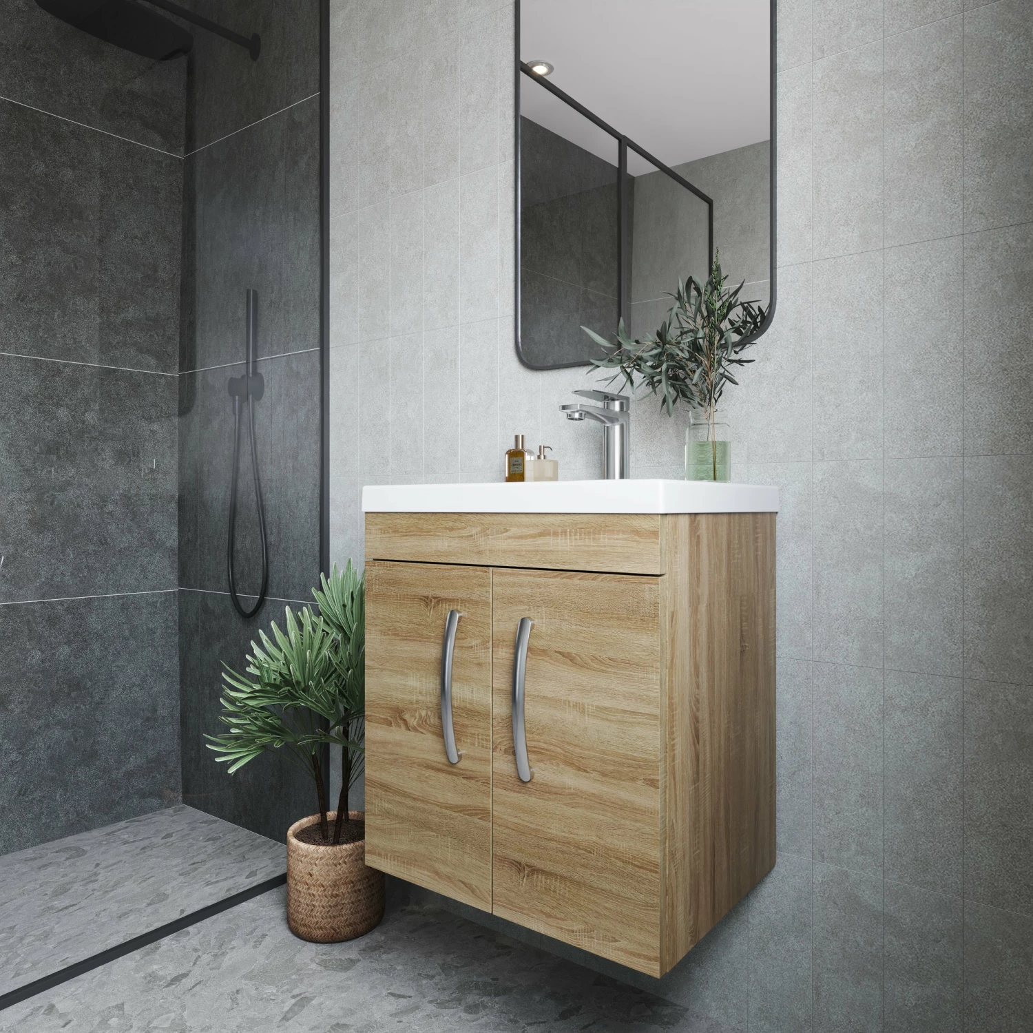 - Unique natural oak finish compliments any modern bathroom to create a designer look