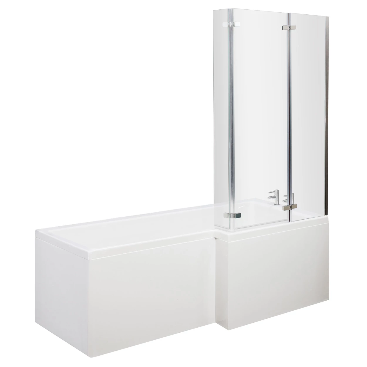 - Space-saving dual purpose bath and shower enclosure in modern L-shaped design