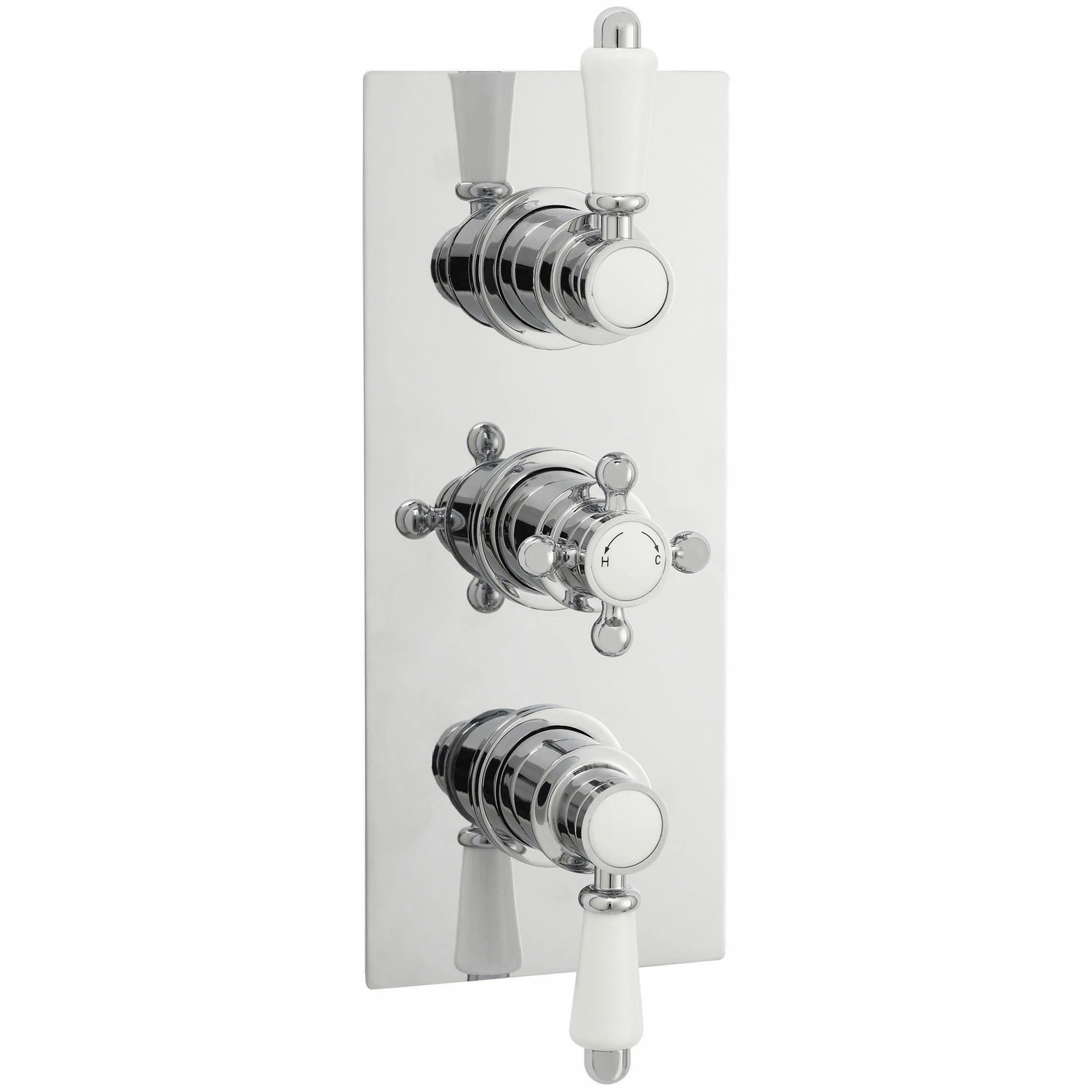 - Top control operates one shower accessory, centre adjusts temperature, bottom control operates the other shower accessory