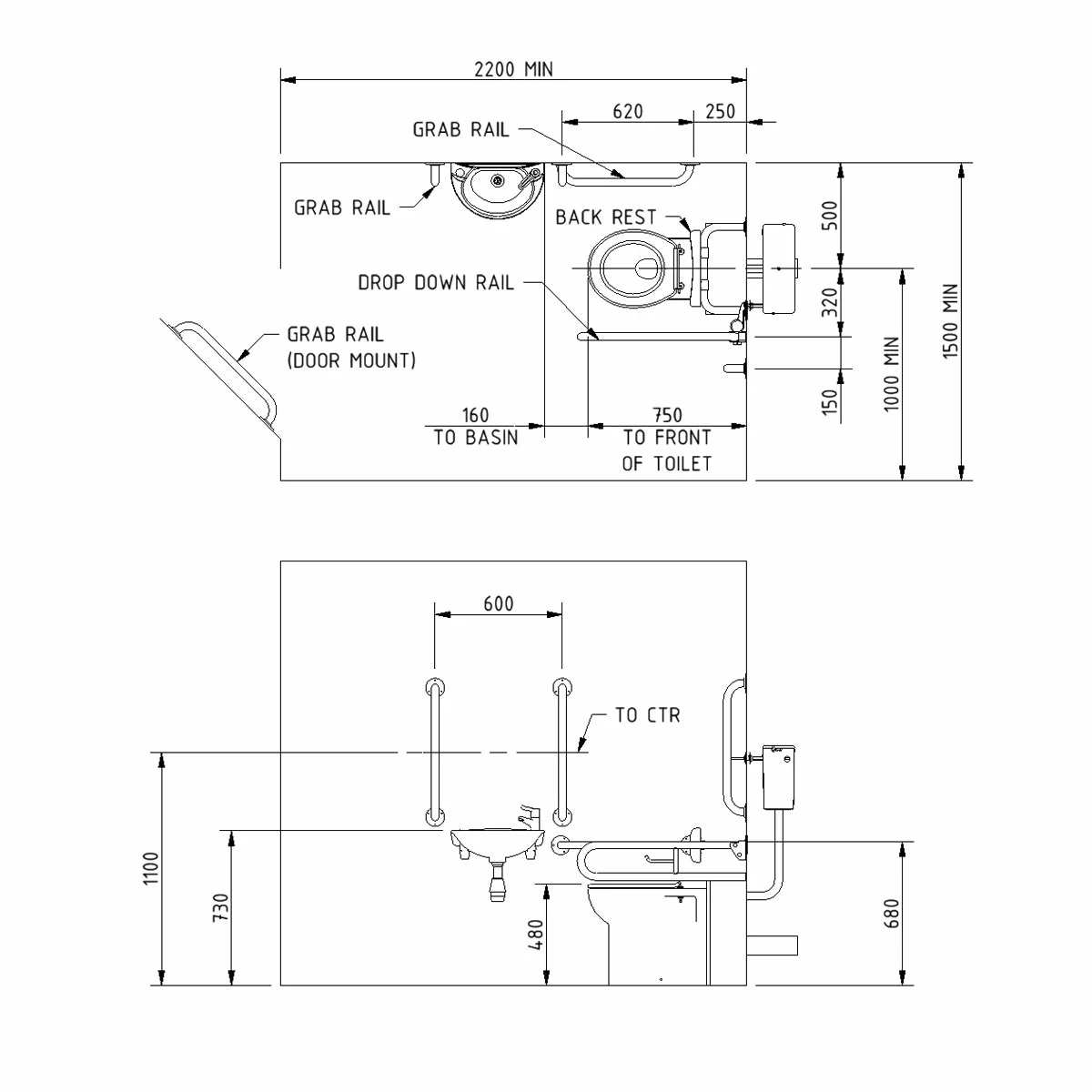 - 5 x 600mm coated steel grab rails with exposed fixings