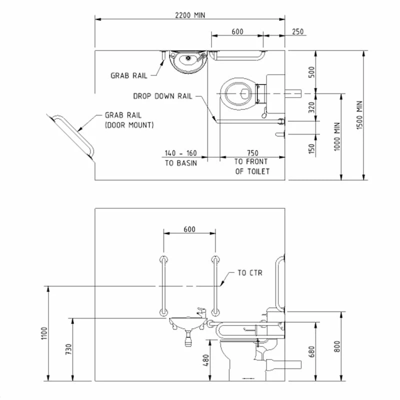 - 5 x 600mm coated steel grab rails with exposed fixings