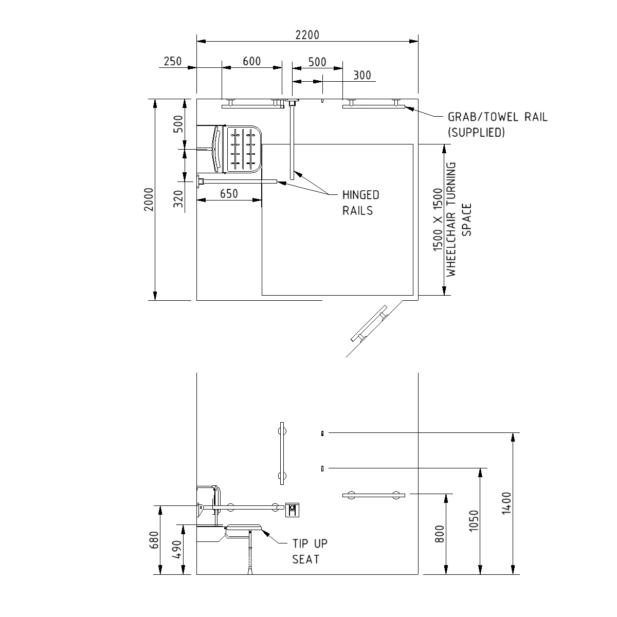 - 3 x 600mm stainless steel luxury grab rail with concealed fixings