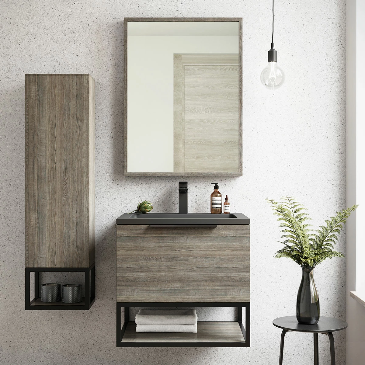 - Comes in grey oak finish