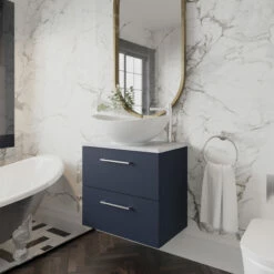 Nuie Arno Wall Hung 2-Door Vanity Unit With Sparkling White Worktop 600mm Wide – Electric Blue