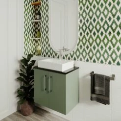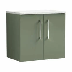 Nuie Arno Wall Hung 2-Door Vanity Unit With Sparkling White Worktop 600mm Wide – Satin Reed Green