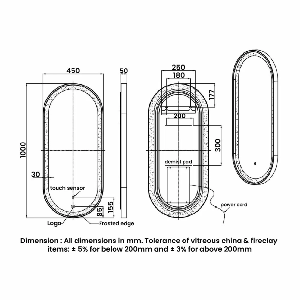 RAK Art Oval LED Illuminated Bathroom Mirror With Demister Pad 1000mm H X 450mm W – Matt Black