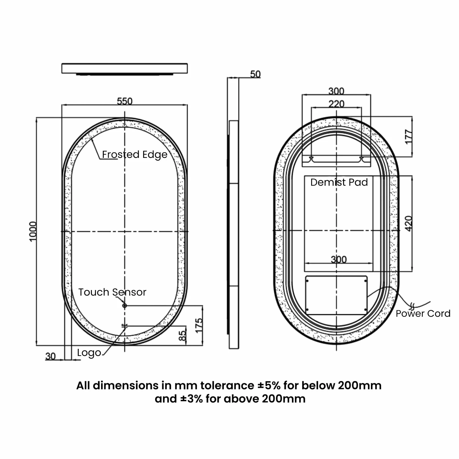 RAK Art Oval LED Illuminated Bathroom Mirror With Demister Pad 1000mm H X 450mm W – Matt Black