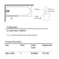 Merlyn Black Square Fixed Framed Bath Screen 1500mm H X 800mm W – 8mm Glass